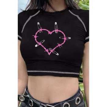 T-shirt Harajuku Fashion Safety Pin Heart Siyah Yarım